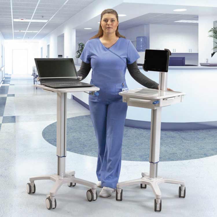 SlimCart™ documentation cart delivers ultra-lightweight mobility and cost-effective performance for point-of-care documentation. This compact, non-powered documentation cart glides effortlessly through tight spaces while providing exceptional value for budget-conscious facilities.Designed for versatile workflows, the documentation cart offers flexible mounting options for laptops, tablets, or monitors, plus a generous work surface with slide-out mouse surface and manual height adjustment. Optional key-locking drawers provide secure storage, while high-performance casters ensure smooth maneuverability, delivering essential documentation cart functionality without powered complexity.