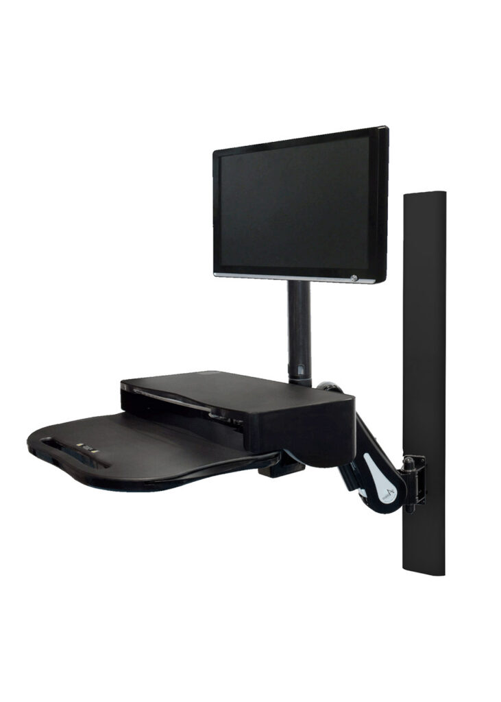 The Falcon Combo Arm is a highly ergonomic wall mounted workstation designed to support efficient charting and documentation at the point of care. With sit-to-stand height adjustment and independent monitor height/angle adjustment, clinicians can quickly position the workstation for comfort. An integrated basket keeps barcode scanners, mice, and other tech accessible while streamlined cable management helps maintain clean, organized workspaces.