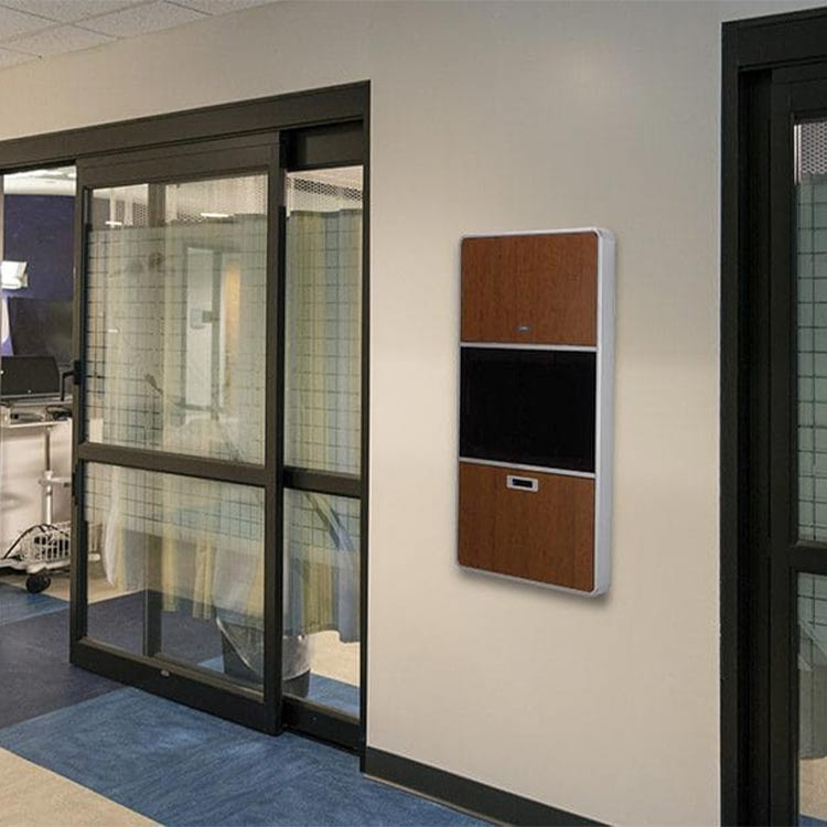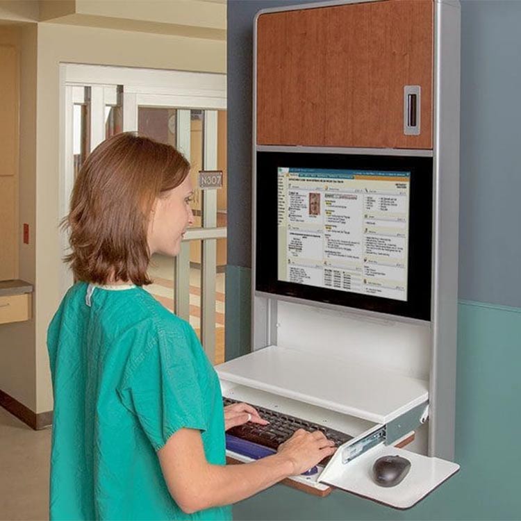 Computer wall cabinet workstations promote a professional appearance in the healthcare setting. The 430 Wall Cabinet comes in a variety of finishes with ergonomic positioning of keyboard and monitor, a large work surface and mouse area, and an task light.